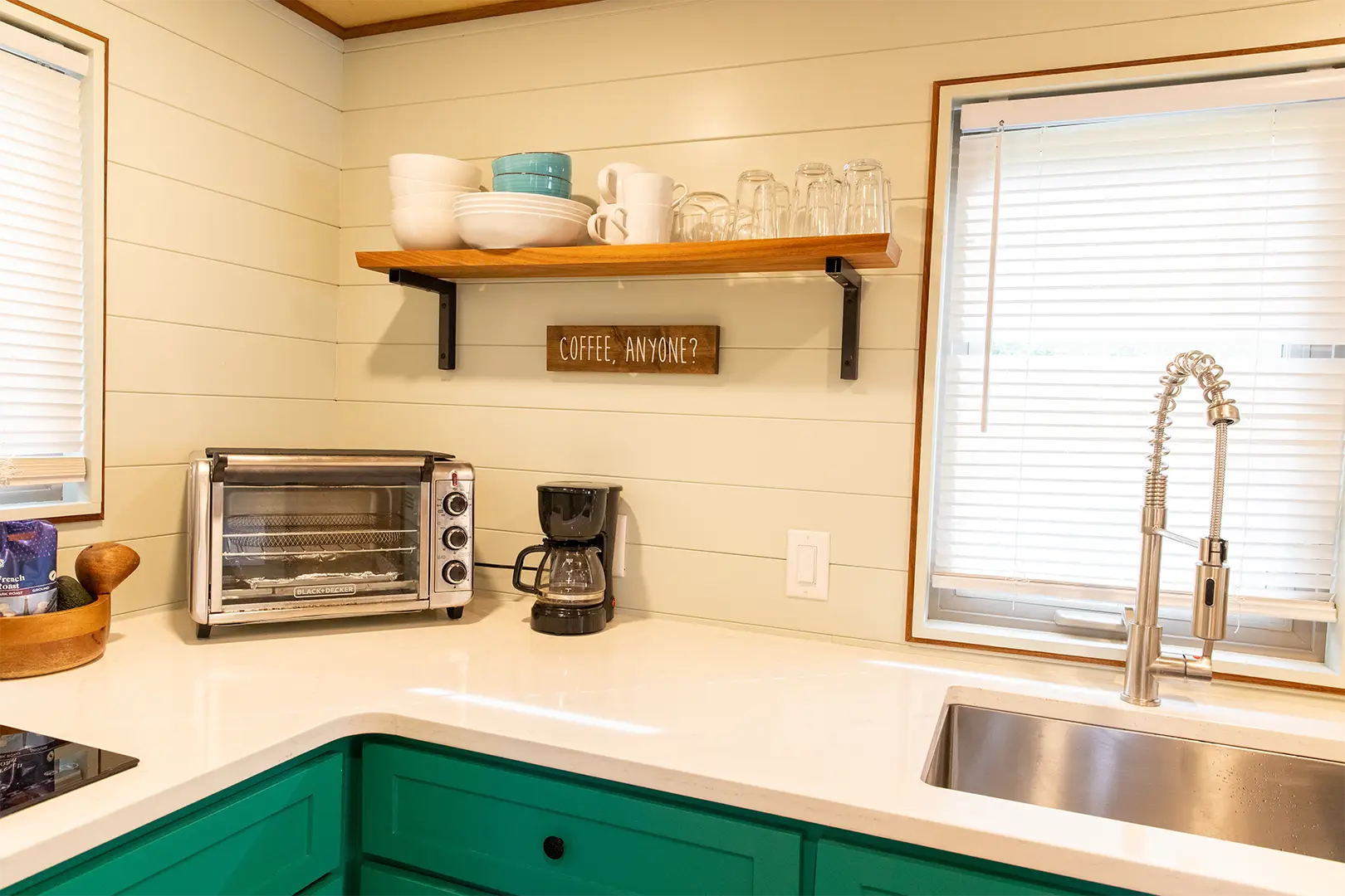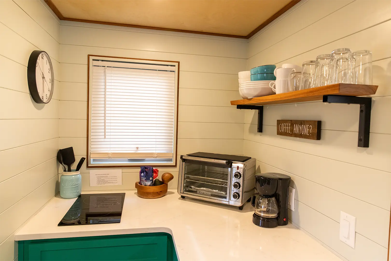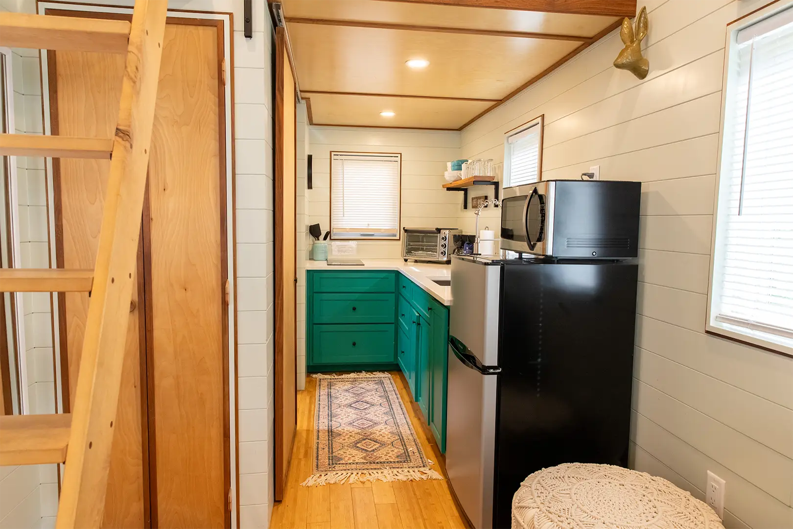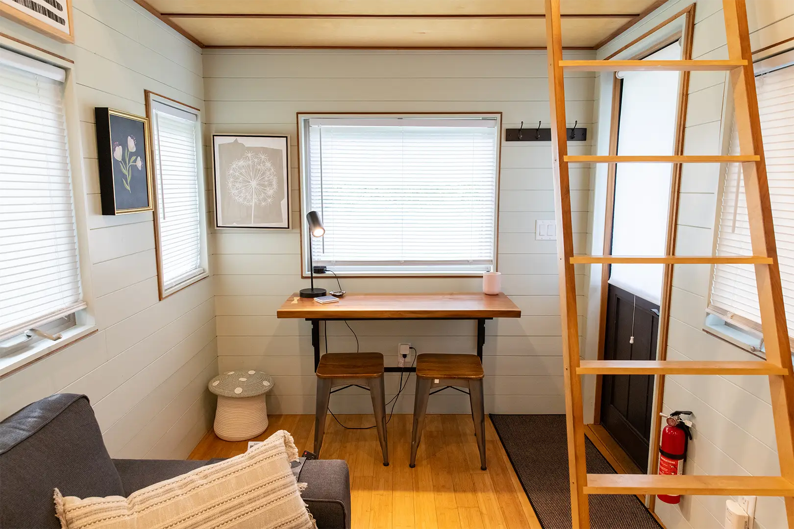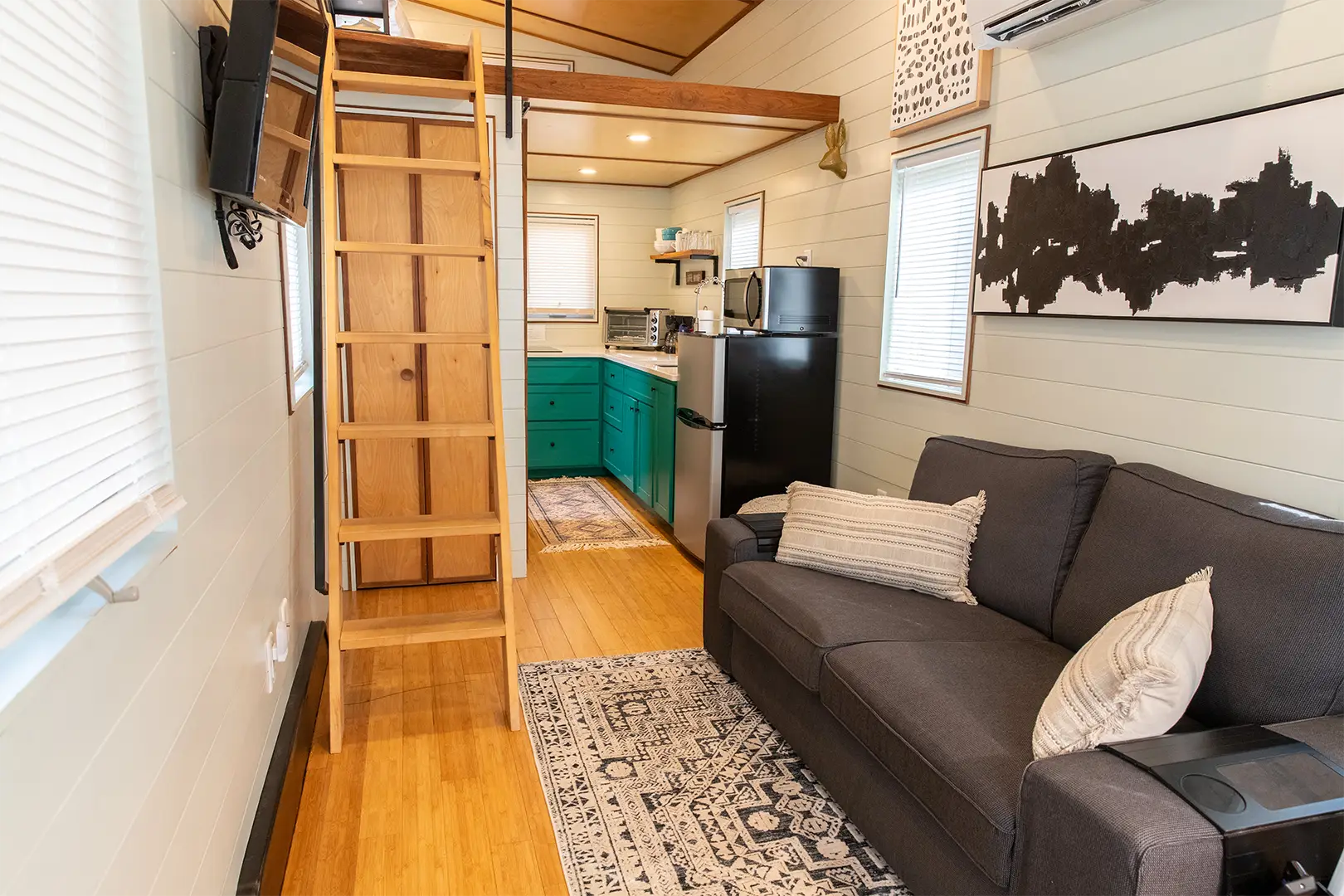 With a floor area of a total of 296 ft.² that includes the main floor, and the two lofts. The fully functioning kitchen features a two-burner induction stove top, air fryer-toaster oven, refrigerator, and microwave, making meal preparation a breeze.